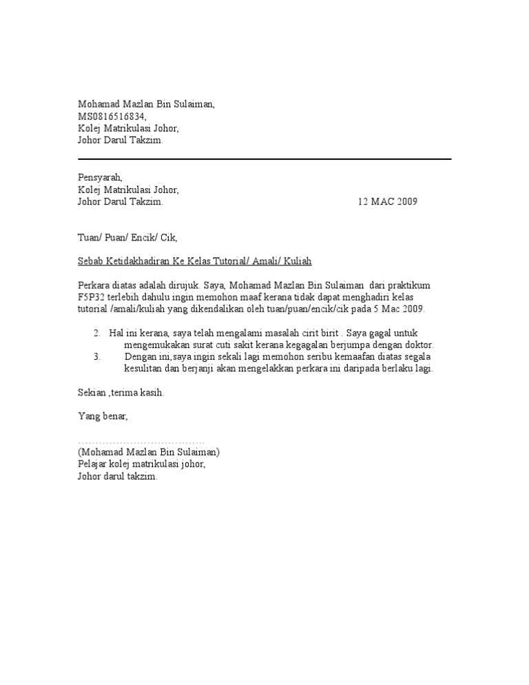 Ada banyak hal yang bisa menyebabkan hal tersebut. Contoh surat izin sakit adalah surat yang digunakan untu keperluan izin ketika dalam keaadan sakit, ketika seseorang dalam keadaan sakit, pastinya anda akan membutuhkan surat izin sakit berikut hormat saya, fathur rozi. Dalam artikel ini, glints telah menyiapkan empat contoh surat cuti kerja, yang terdiri atas cuti tahunan, sakit, melahirkan dan berduka. Pengajuan cuti semacam ini biasanya disertai dengan surat keterangan dari dokter atau rumah sakit apabila diperlukan. Yang terhormat, kepala bagian personalia pt.